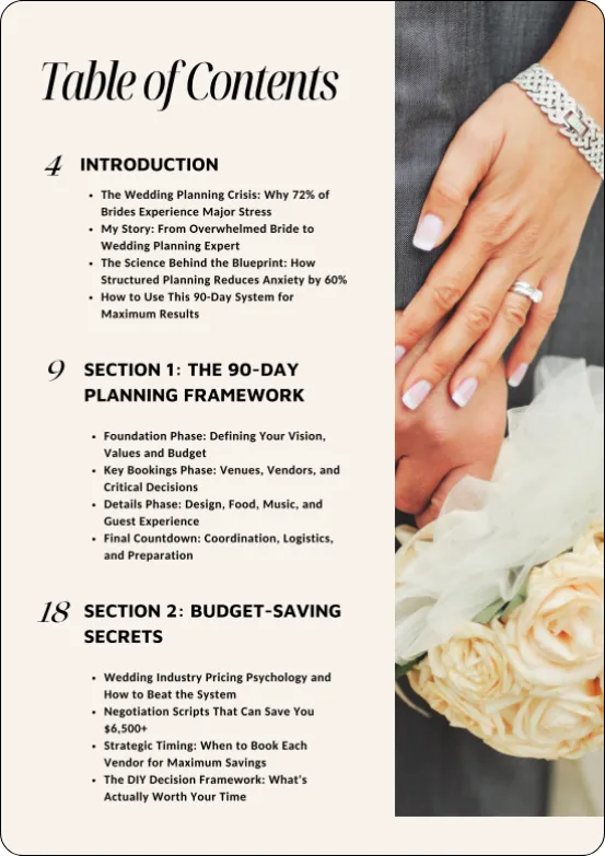 "I felt so lost before I found this blueprint. I had no idea where to start or what to focus on. Now I feel calm and in control. I actually enjoy planning my wedding now and I am not scared I will forget something."